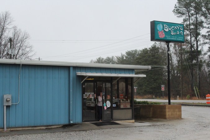 Monk: In the midst of a heck of an undefeated season for the Carolina Panthers, as season ticket holders, Speedy, Mrs. Monk, and I headed down to the ATL to support our team. While our trip actually in Atlanta was a bit whirlwind in nature (and unfortunately included a Panthers L), it at least afforded us a chance to grab barbecue on the way back to NC. Consulting the SC Barbecue Association’s 100 Mile BBQ site, I picked the Roper Mountain Road location of the four Bucky’s Bar-B-Q locations in Greenville.