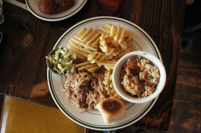 Whole hog pulled pork plate from Buxton Hall Barbecue