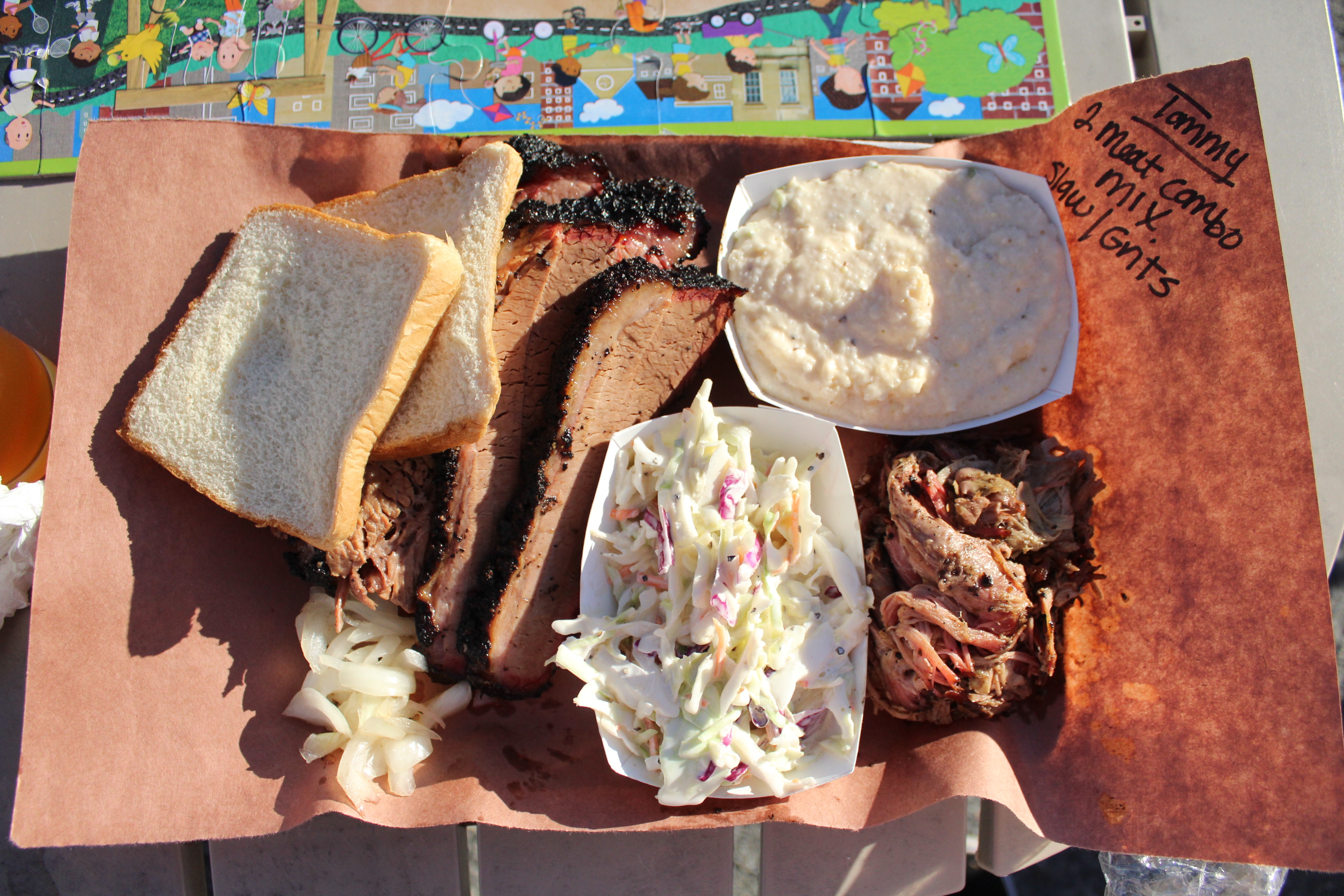 Order: Two meat platter (brisket and pulled pork) with coleslaw and jalapeno cheddar grits