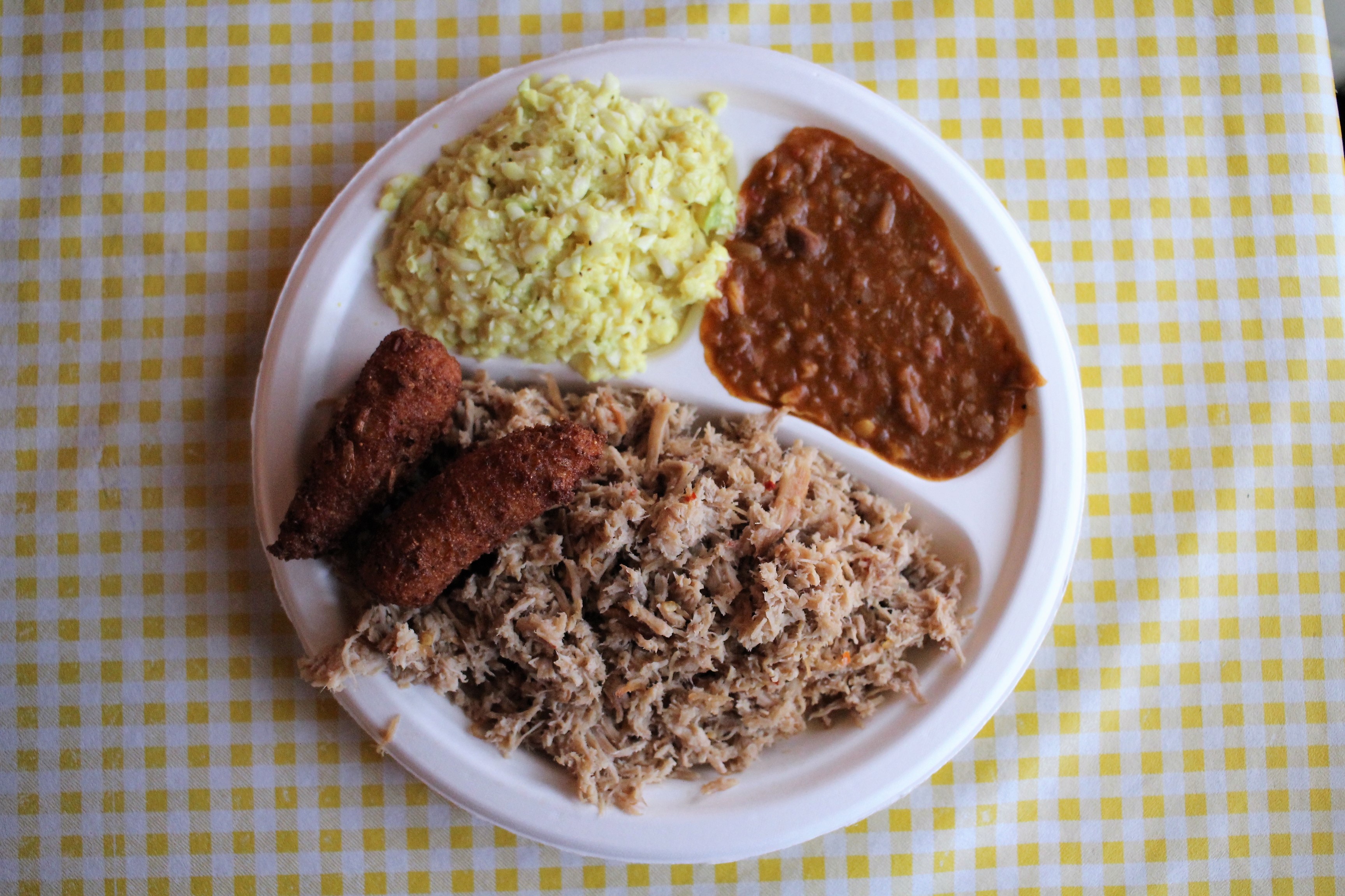 The hush puppy basket was late in arriving, coming after our plates had come. But that likely saved me from overeating on the delicious, slightly-sweet cornmeal pups. I have come to appreciate the mustard-based slaw, even if it will never be my favorite style. And the beans were fine.
