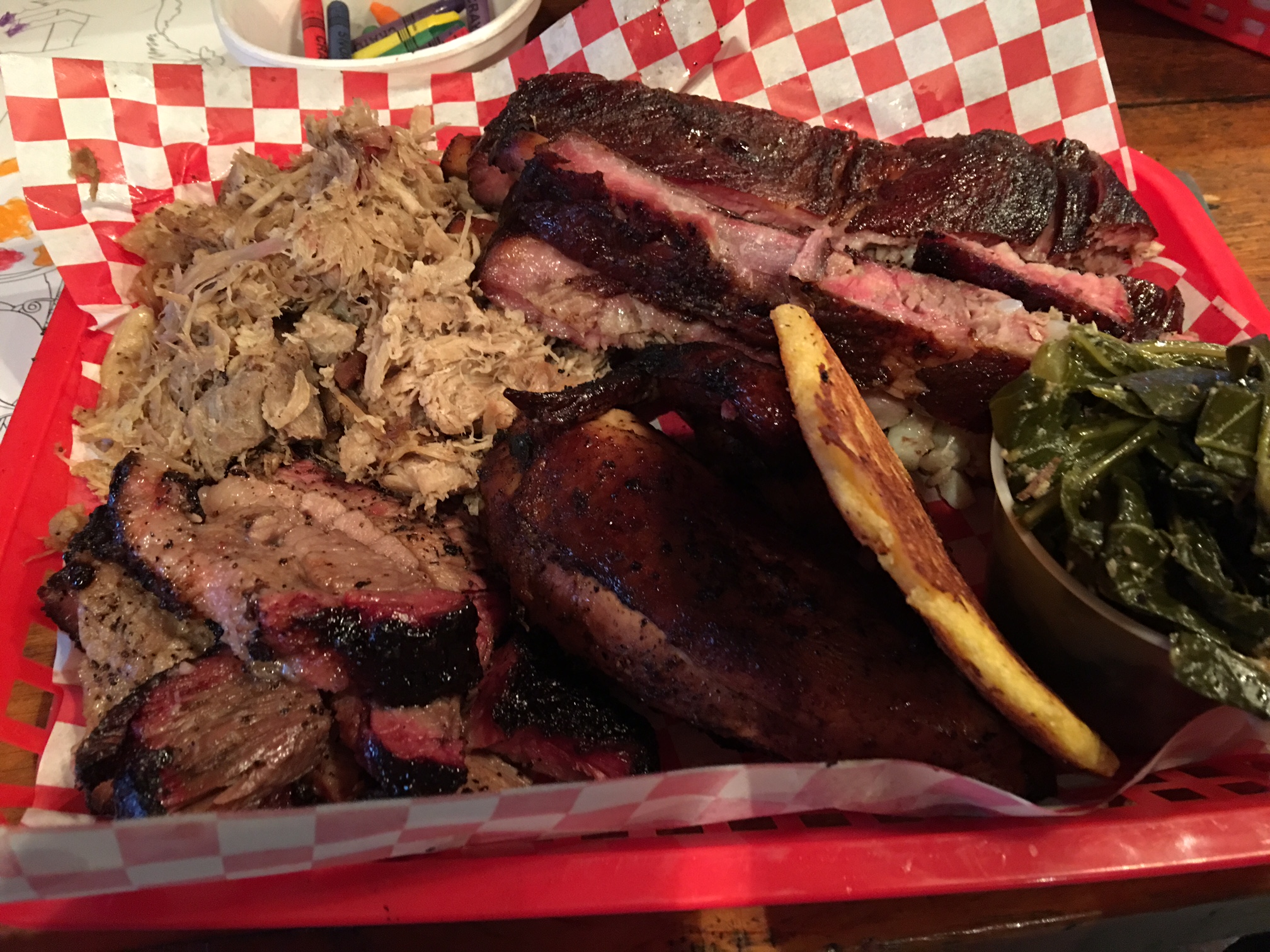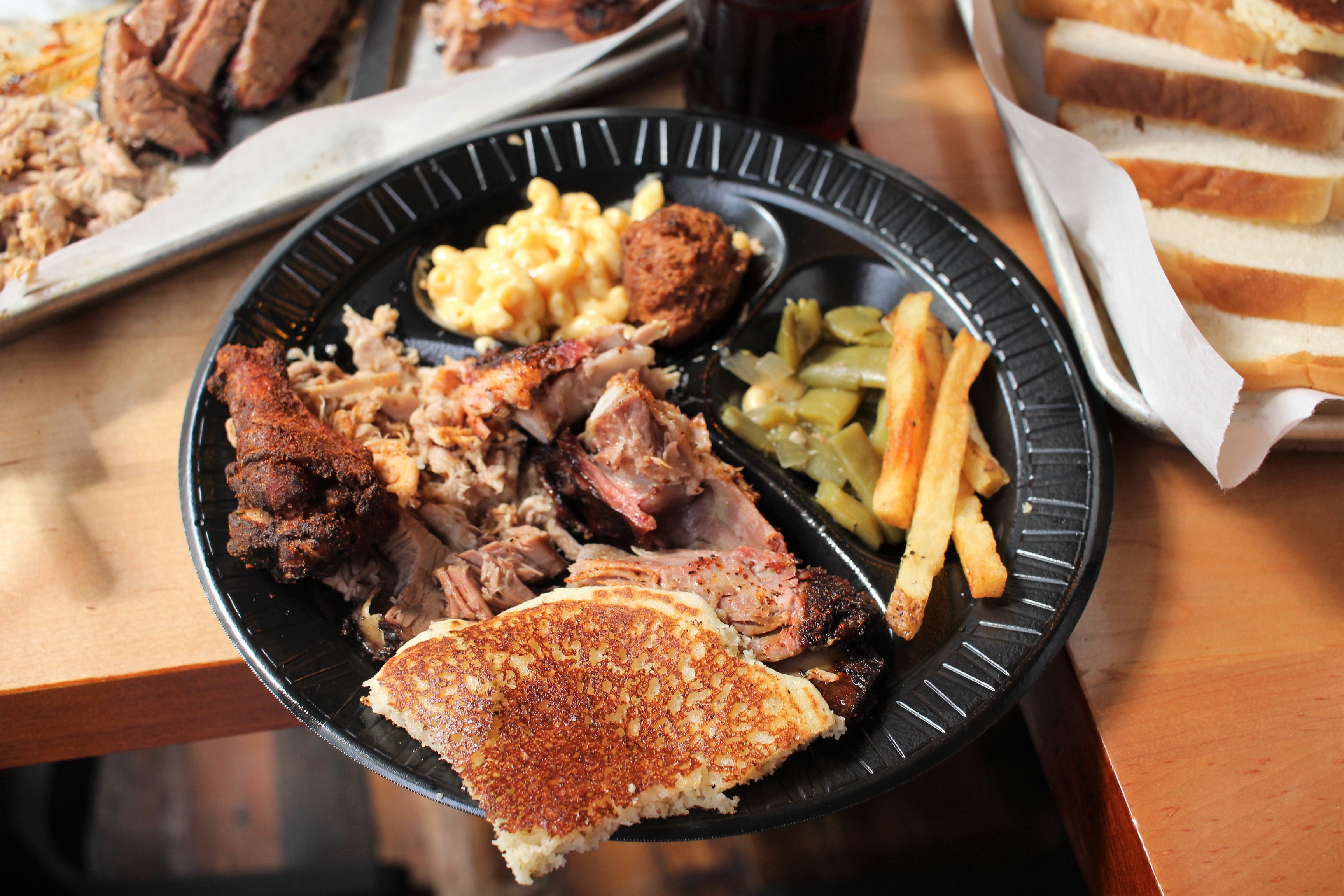 Order: Big Poppa Sampler (Full Rack Ribs, 12oz Pork, 12oz Brisket, ½ Chicken, mac and cheese, green beans, fries) with 6 Memphis dry rub wings, 2 orders of hush puppies, and 2 cornbread hoe cakes (link to menu)